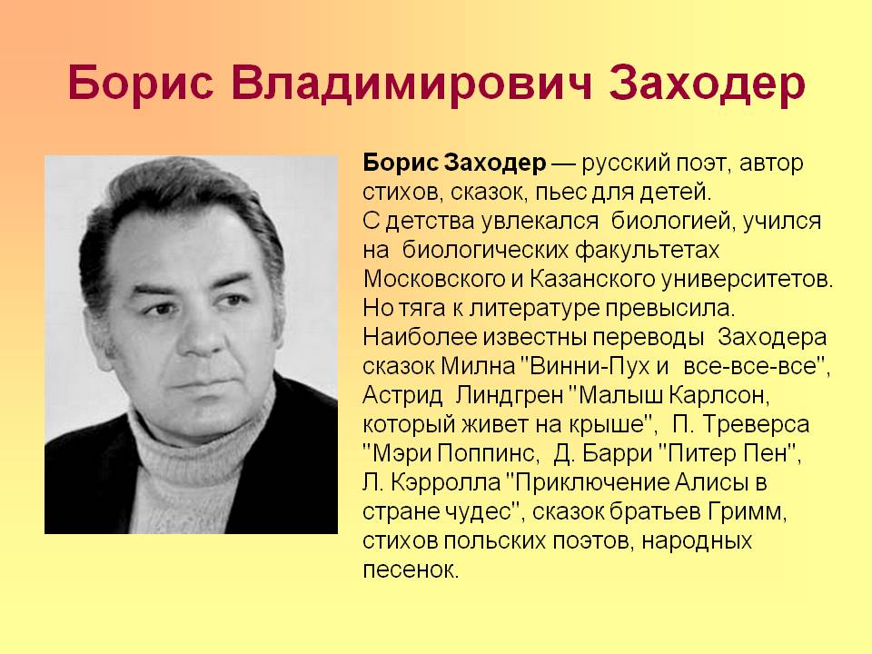 Писатель Борис Заходер вошел в историю отечественной литературы как блестящий переводчик зарубежных произведений. Он познакомил русскоязычных детей с такими сказками и повестями, как «Винни-Пух и все-все-все» Алана Милна, «Мэри Поппинс» Памелы Трэверс, «Приключения Алисы в Стране чудес» Льюиса Кэрролла, «Бременские музыканты» братьев Гримм и «Питер Пэн» Джеймса Мэтью Барри. Также Заходер адаптировал на русский язык стихотворения Яна Бжехвы, Уильяма Джея Смита, Людвига Керна, Юлиана Тувима и многих других авторов. Всю свою жизнь он отстаивал право публиковать на титульных листах книг сноску «Пересказал Заходер» — именно «пересказал», а не «перевел».