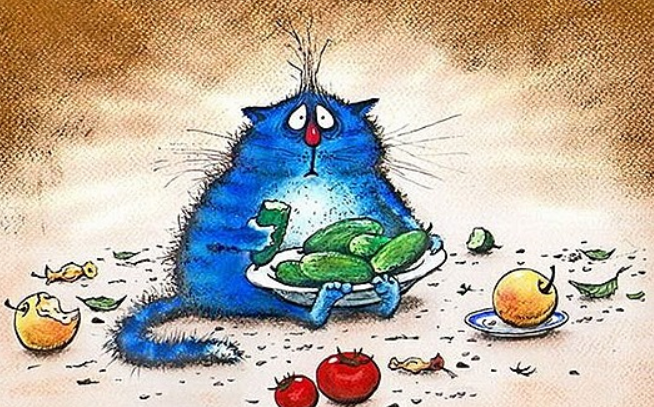 Убедиться в этом помогут шуточные работы Ирины Зенюк, которая всё своё творчество посвятила очаровательным мурлыкам, представив их в весьма непривычном глазу синем цвете. И нужно отдать ей должное, ведь получилось очень ярко, забавно и мило…
