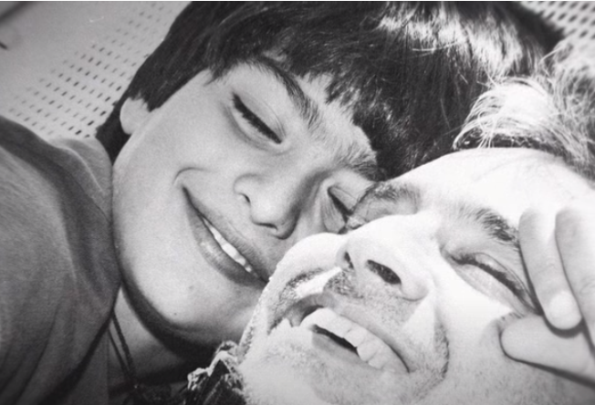 Улыбка отца, когда его сын начал петь. Эта улыбка красноречиво говорит о его любви и гордости за своего сына.